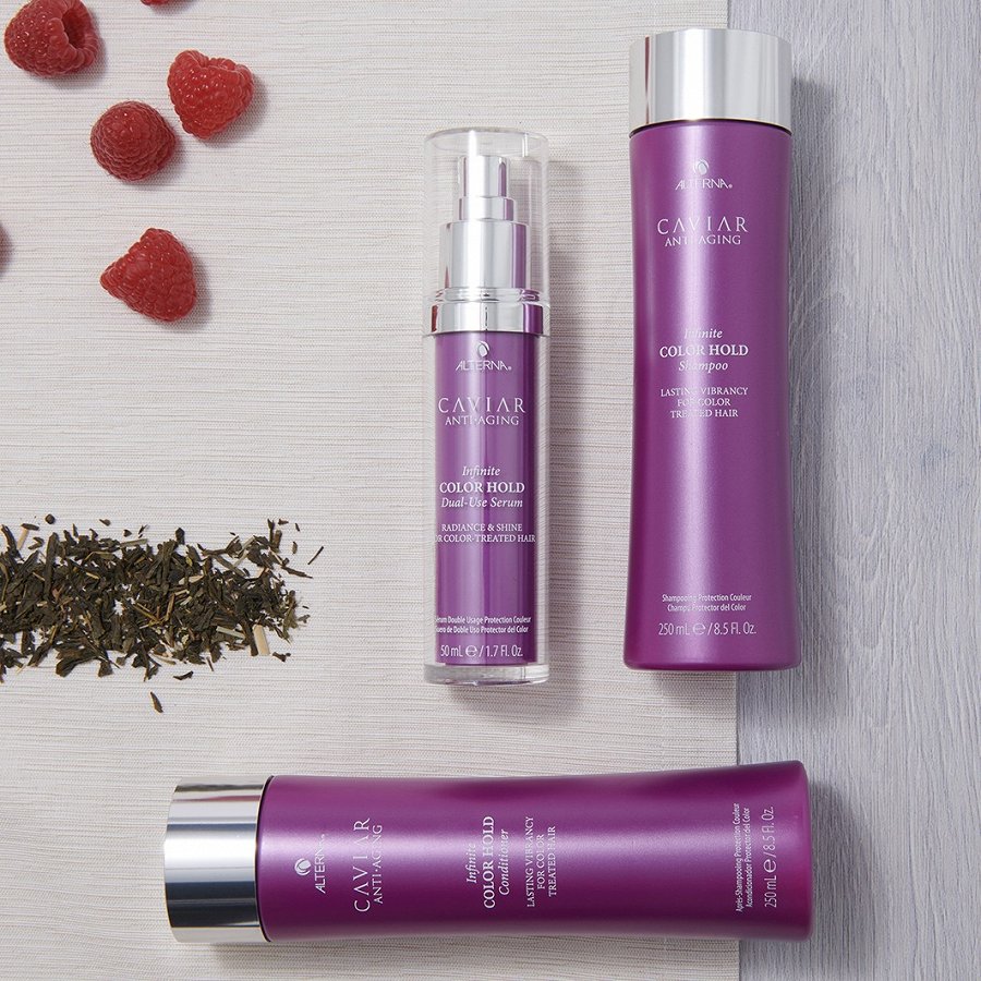 ALTERNA Caviar Anti-Aging Infinite Color Hold Dual-Use Serum matu krāsu atdzīvinošs serums spīdumam un UV aizsardzībai krāsotiem matiem. Matu krāsu atdzīvinošs serums spīdumam un UV aizsardzībai krāsotiem matiem, ko var izmantot kā matos atstājamu, intensīvi kopjošu līdzekli, lai atjaunotu matu dabisko mirdzumu, vai kā matu masku, lai atdzīvinātu matu krāsu un atjaunotu tās spilgtumu. Piemērots visiem, kam krāsoti mati un kas vēlas aizsargāt matu krāsu no izbalēšanas. Pamatsastāvdaļas: Dual Capture komplekss - unikāla tehnoloģija, kas satur aveņu lapu eļļu un saulespuķu sēklu eļļu. Dabiski antioksidanti, kas satur A, C un E vitamīnus, kā arī omega-3 taukskābes, kas aizsargā matu krāsu no izbalēšanas un palīdz saglabāt tās spilgtumu. Kaviāra ekstrakts satur aminoskābes un omega-3 taukskābes, kas nogludina matu virsmu un nodrošina spīdumu. Seasilk® jūras augu maisījums, kas nodrošina izteiktu mitrināšanu un palīdz atjaunot bojātus matus. Enzīmu terapija® - ekskluzīvs enzīmu un minerālvielu maisījums, kas nodrošina barības vielu iesūkšanos dziļi matos.