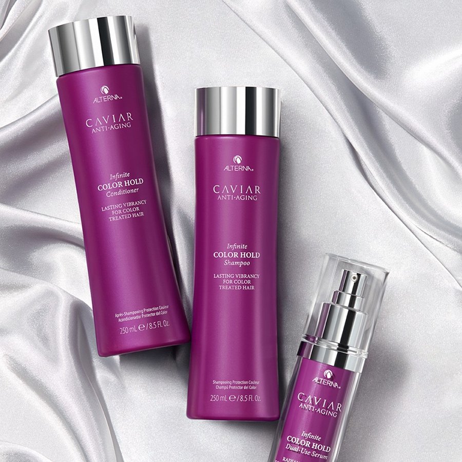 ALTERNA Caviar Anti-Aging Infinite Color Hold Shampoo matu krāsu aizsargājošs šampūns krāsotiem matiem. Maigs, sulfātus nesaturošs šampūns, kas aizsargā no UV starojuma kaitīgās ietekmes un palīdz aizkavēt matu krāsas izbalēšanu. Atjauno ķīmiski apstrādātu matu mitruma līdzsvaru. Piemērots visiem, kam krāsoti mati un kas vēlas aizsargāt matu krāsu no izbalēšanas. Mitrina matus un palīdz aizkavēt matu krāsas izbalēšanu. Aizsargā matu krāsu no izbalēšanas arī mazgāšanas laikā, nogludina matu virsmu, padarot matus ievērojami mirdzošākus un matu krāsu spilgtāku. Pamatsastāvdaļas: aveņu lapu eļļa un saulespuķu sēklu eļļa, dabiski antioksidanti, kas satur A, C un E vitamīnus, kā arī omega-3 taukskābes, kas aizsargā matu krāsu. Kaviāra ekstrakts, kas satur aminoskābes un omega-3 taukskābes, kas palīdz nogludināt matu virsmu un nodrošina spīdumu.