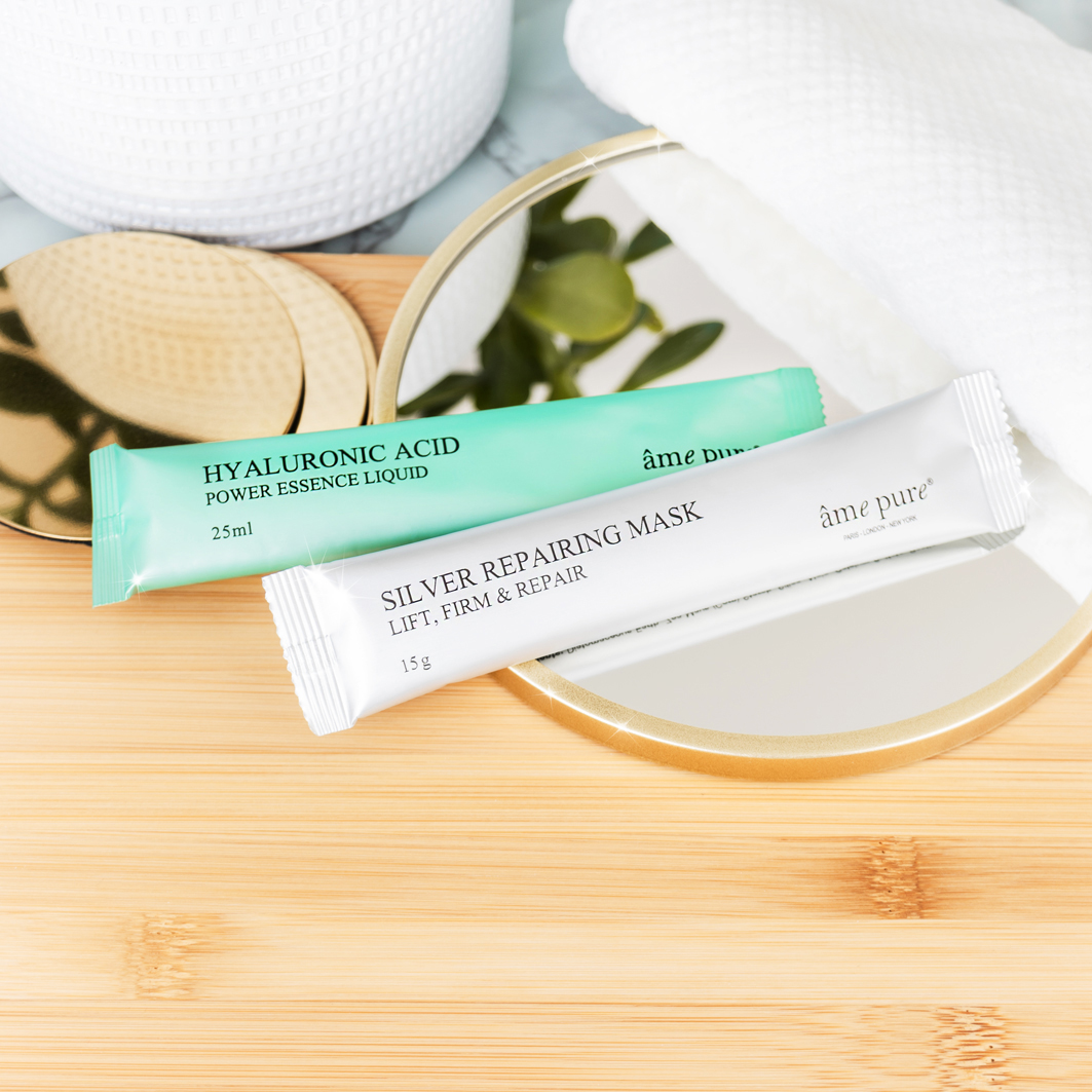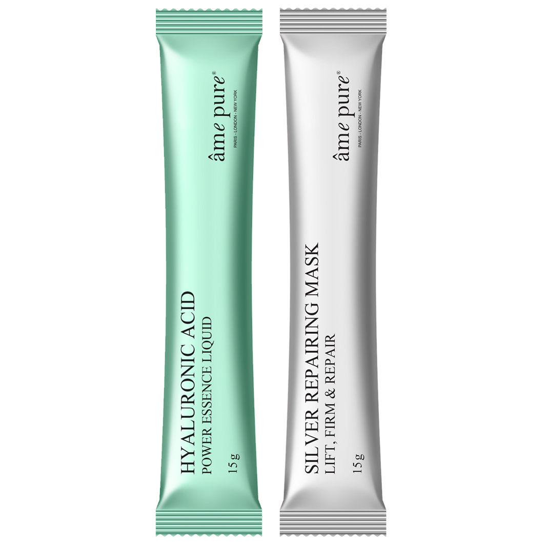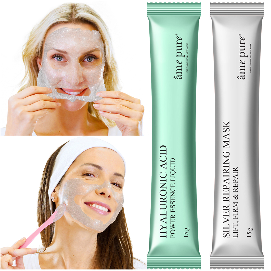 Sajauciet hialuronskābes šķidrumu un pulveri un uzklājiet uz ādas, kas tik ļoti alkst pēc nepieciešamā mitruma.