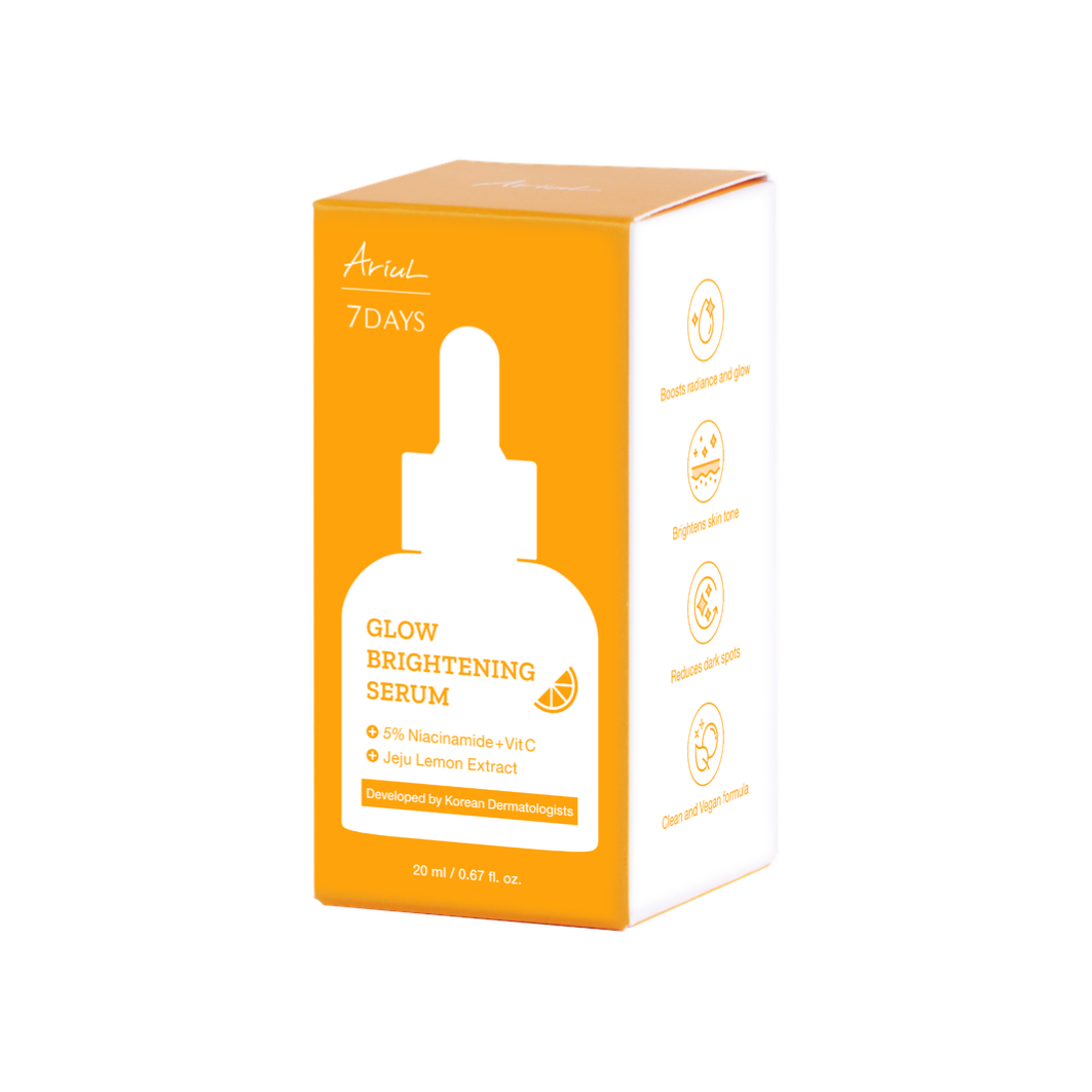 ARIUL 7days Glow Brightening Serum C vitamīna un niacinamīda serums palīdz samazināt plankumu un poru redzamību, mazina iekaisumu – lielisks risinājums taukainai ādai. Mūsu izgaismojošais serums veicina ādas virsējo šūnu atjaunošanos, uzlabojot ādas tekstūru un vienmērīgu toni. Piemērots novecojošai un taukainai ādai, pateicoties aktīvajām sastāvdaļām: niacinamīds, citronu ekstrakti un C vitamīns.