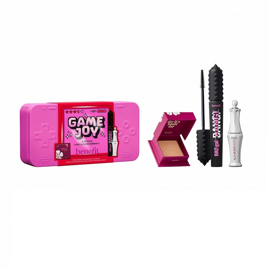 Atklājiet BENEFIT Ziemassvētku komplektu Gamejoy – nepārspējamu skropstu, uzacu un bronzera trio, kas radīts, lai acumirklī uzlabotu jūsu šarmu. Sāciet drosmīgi ar BADgal BANG! – pilna izmēra apjomu piešķirošu skropstu tušu izteiksmīgām skropstām, kas saglabā 360° kuplumu līdz pat 36 stundām*. Parūpējieties par nevainojami fiksētām uzacīm visas dienas garumā ar 24-HR Brow Setter mini izmēra gelu. Visbeidzot, piešķiriet ādai viegli iesauļota mirdzuma efektu ar leģendārā Hoola bronzera mini versiju – neaizstājamu līdzekli dabiski siltam tonim un apjomam.