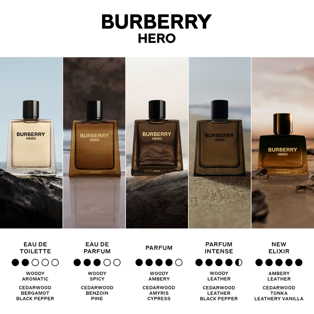 Visintensīvākais aromāts Hero saimē – BURBERRY Hero Elixir de Parfum – līdzsvaro maigumu un spēku. Izteiksmīga, apņemoša tonkas pupiņu, ādainas vaniļas un dzīvīga ciedrkoka trio saspēle atklāj vīrišķības dualitāti. Ekskluzīvi veidotās pudelītes stūrainā forma ir abstrakta zirga naga interpretācija, ko rotā Equestrian Knight Design emblēma uz vāciņa. Spēcīgs un maigs. Drosmīgs un jūtīgs.
