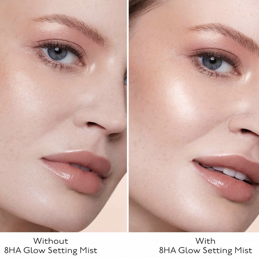 HYALURONIC GLOW SETTING MIST var lietot arī bez grima – lai mitrinātu, aizsargātu un uzlabotu ādas izskatu.