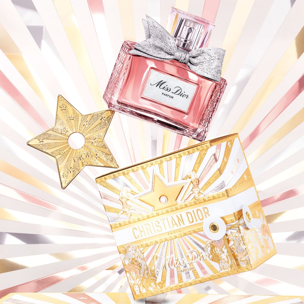 Svētku sezonā DIOR Miss Dior Parfum - Limited Edition ir ievietots kastītē, uz kuras redzams cirka pasaules iedvesmots motīvs: zelta freska, ko papildina ikoniskā DIOR zvaigzne un DIOR kvalitātes lente.