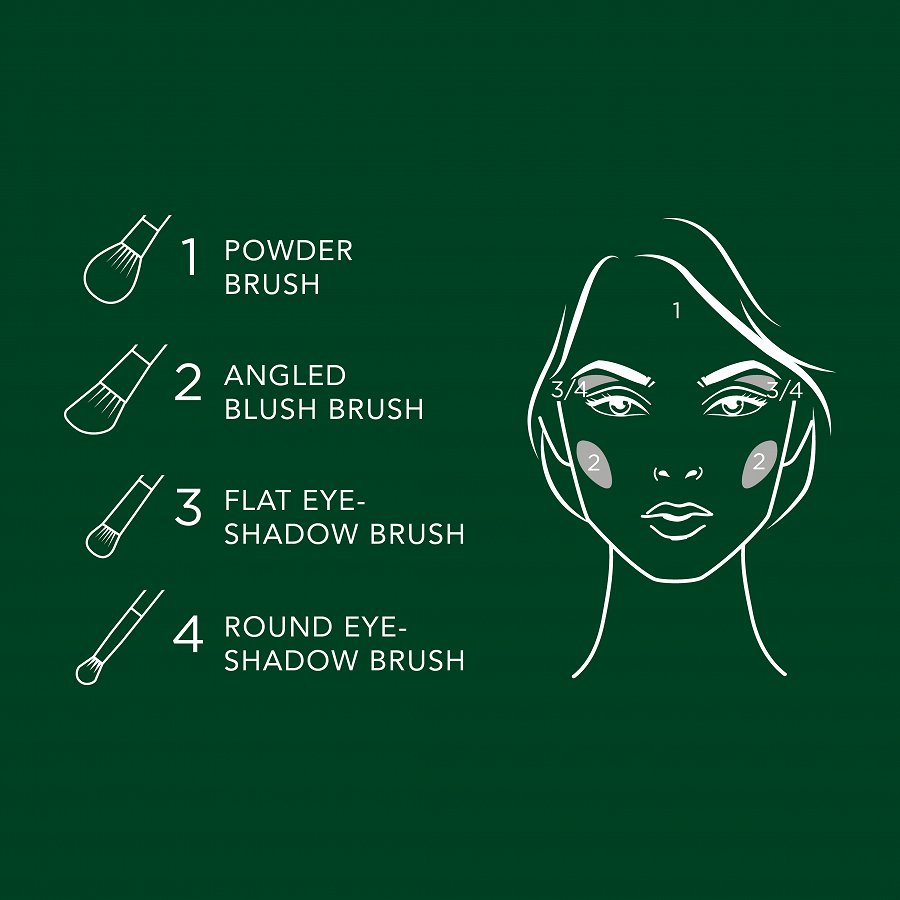 "Ar pūdera otu uzklājiet pūderi grima fiksēšanai vai bronzeri. Ar slīpo otu vaigu sārtumam piešķiriet formu vaigiem. Ar plakano otiņu uzklājiet acu ēnas uz plakstiņiem un tad tās izpludiniet ar noapaļoto otu. Ideāli piemērots grima pielabošanai ceļojumos vai lietošanai ikdienā. Regulāri izmazgājiet ar maigām ziepēm."