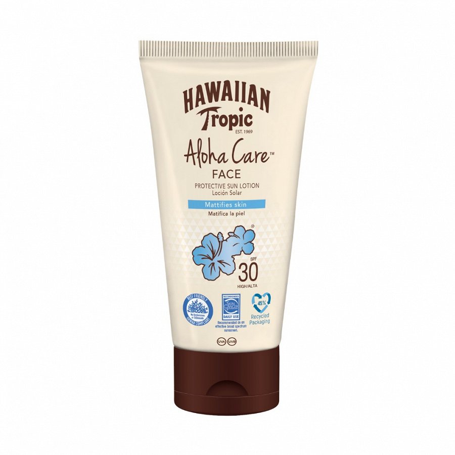 Ūdensizturīga sauļošanās emulsija, kas satur tropisko augu un augļu ekstraktus, ir ādai un videi draudzīga. HAWAIIAN TROPIC Aloha Care Mattifiying Tanning Lotion Face SPF 30 viegli matējošā emulsija aizsargā ādu no UVA un UVB stariem, nesatur oksibenzonu un oktinoksātu un nekaitē ekosistēmai un koraļļiem. Emulsija ātri iesūcas ādā un mīkstina to, novēršot saules apdegumus un priekšlaicīgu novecošanos. Starptautiskā Ādas vēža organizācija iesaka produktu kā efektīvu un drošu saules aizsardzības līdzekli.