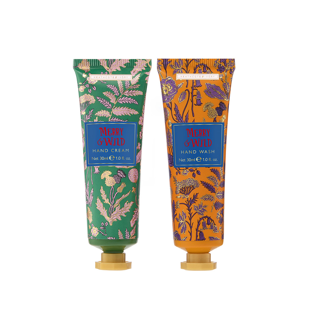 Samtainais kosmētikas maciņš satur vegānu roku mazgāšanas līdzekli 30 ml un roku krēmu 30 ml. Aromatizēti ar eikalipta, lavandas un pačūlijas eļļām, kā arī papildināti ar zaļo lapu, maijpuķīšu un sandalkoka notīm.