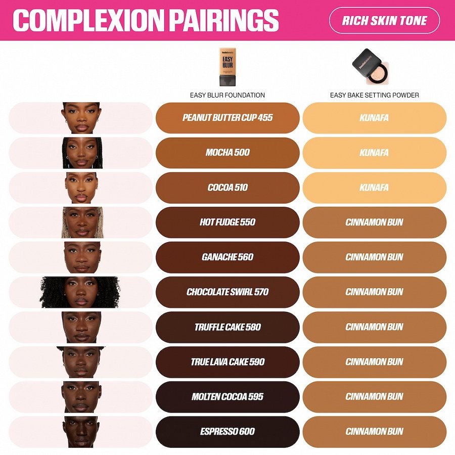 Lai sejas āda izskatītos nevainojama un zīdaini gluda, izpildiet šo VIENKĀRŠO PROCEDŪRU! 1. solis. Sāciet ar grima bāzi Easy Blur Primer un turpiniet ar pārējiem produktiem. 2. solis. Nogludiniet ādu ar mūsu tonālo krēmu Easy Blur Foundation. Lai iegūtu vēl zīdaināku efektu, izmantojiet HUDA BEAUTY Base Brush, kas perfekti izlīdzina tonālo krēmu. 3. solis. Nofiksējiet pārklājumu ar mūsu pūderi Easy Bake Loose Setting & Baking Powder nevainojami zīdainai ādai. Easy Bake Loose Setting & Baking Powder zīdaini matētai sejas ādai.