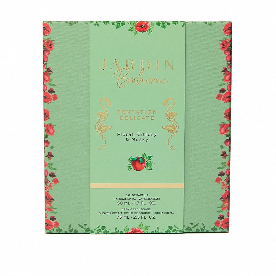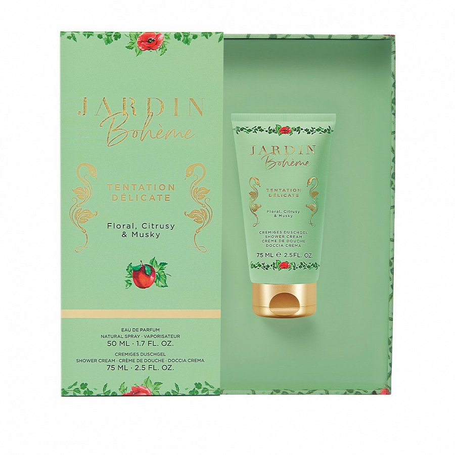 “Jardin Bohème” parfimērijas ūdens “Tentation Délicate” ar kaislīgo, pikanto un ziedu nošu sajaukumu jūs dziļi ievelk ziedu un augļu pārpilnībā. Citronu un piparus ieskauj zaļas lapas, un visu papildina jasmīna un rožu smalkie ziedu akcenti. Veidojumu noapaļo ambra, vetivērija un muskuss. Šo JARDIN BOHÈME Tentation Delicate Value Set smaržu komplektā ir ideāli pieskaņots krēms dušai, kas pastiprina juteklisko iespaidu, saudzīgi attīrot ādu. Burvīgā dāvanu kārbiņa šo komplektu padara par brīnišķīgu pārsteigumu jūsu mīļajiem.