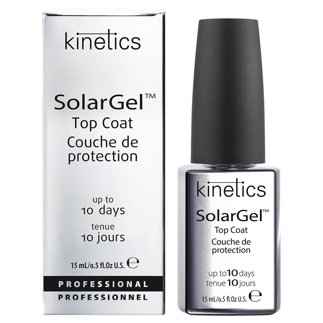 Unikāls nagu lakas pārklājums, kas nav jāžāvē speciālajā UV/LED lampā, tas nožūst kā parasta nagu laka. SolarGel Top Coat pārklājums rada želejlakas efektu un noturīgu spīdumu. Paildzina nagu lakas noturību līdz pat 10 dienām! Jaunais pārklājums savietojams ar jebkuru no Kinetics nagu lakām.