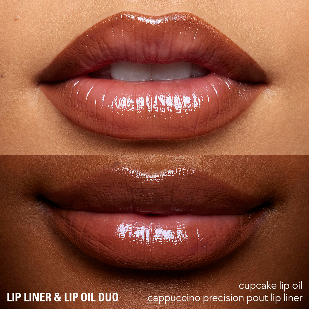 KYLIE COSMETICS Lip Liner & Lip Oil Duo Gift Set dāvanu komplektā ir Precision Pout Lip Liner kontūrzīmulis un fanu iecienītā Lip Oil lūpu eļļa jaunā Cupcake aromātā un tonī. Tas ir ideāls pāris, lai veidotu konturētu un mirdzošu toni. Vispirms ar īpaši precīzo Kylie lūpu kontūrzīmuli izplāno un veido kontūru. Pēc tam uzklāj lūpu eļļu, lai iegūtu gludu, dabiski kuplu izskatu ar vieglu pelēkbrūnu miesaskrāsas toni.