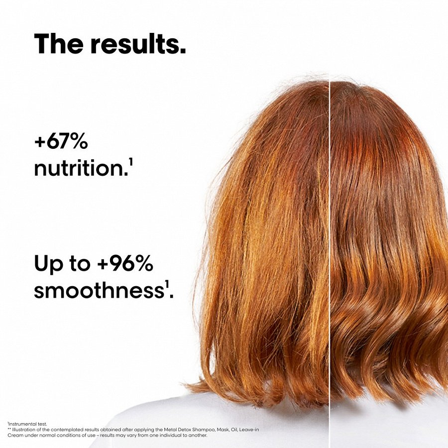 2. Profesionāla Metal Detox maska 75 ml: intensīvi barojoša maska, kas ieskauj matu šķiedras, aizsargājot matus pret metālu daļiņām. Tās formula ir bagātināta ar glikoamīnu — smalku molekulu, kas iekļūst matu šķiedrās un neitralizē ūdenī esošo metālu kaitīgo iedarbību. Mati kļūst 10x mitrinātāki* un par 96 %* gludāki, tādējādi tie ir mīksti, atsperīgi un viegli atšķetināmi.