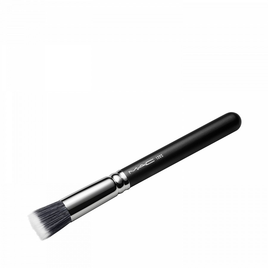 MAC 130 Synthetic Short Duo Fibre Brush īsa, apaļa ota ar plakanu galu, kas ideāli piemērota vienmērīgai, ērtai tonālo krēmu, krēmu, emulsiju un atsevišķu pulvera produktu, it īpaši visu Mineralize produktu, uzklāšanai.