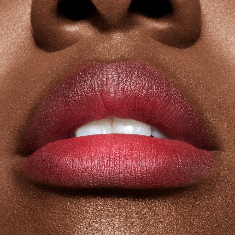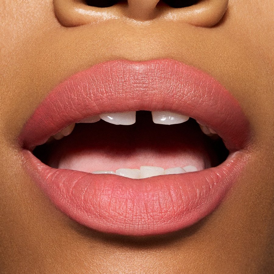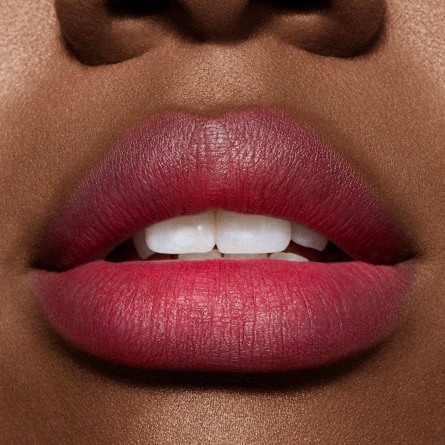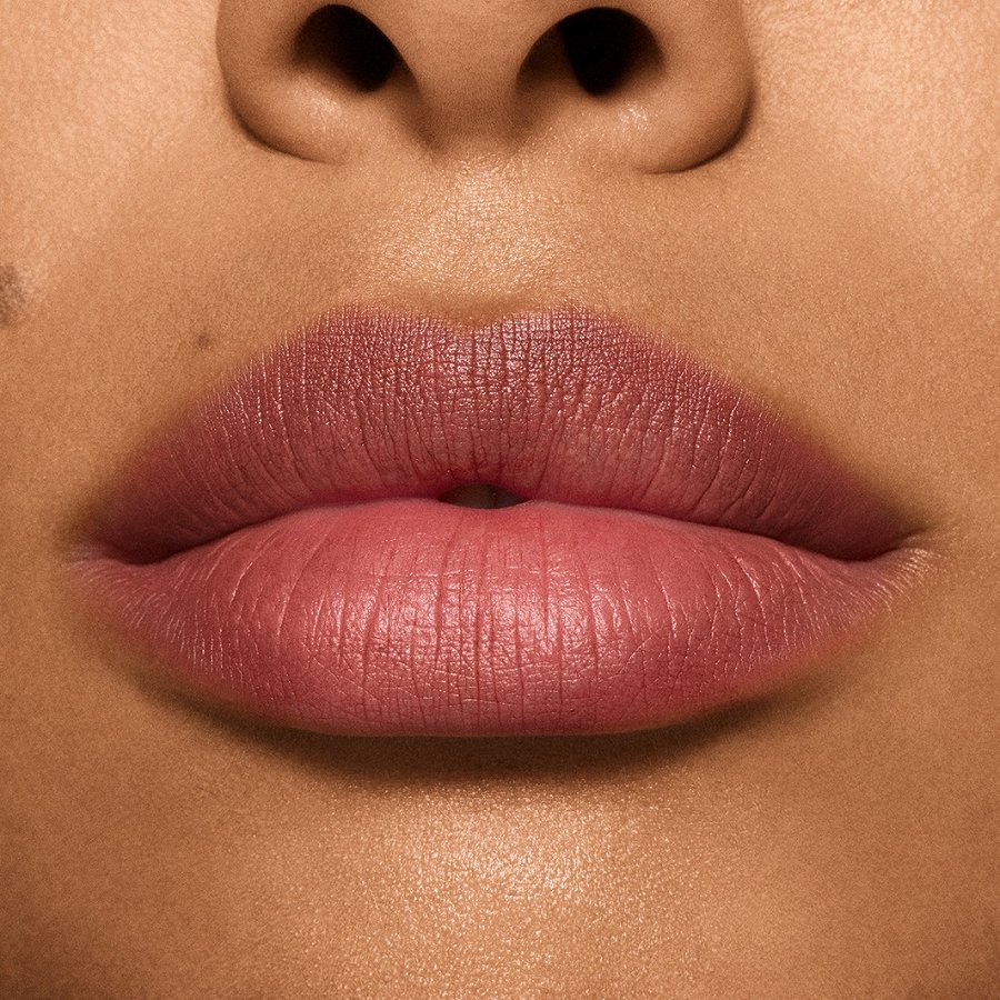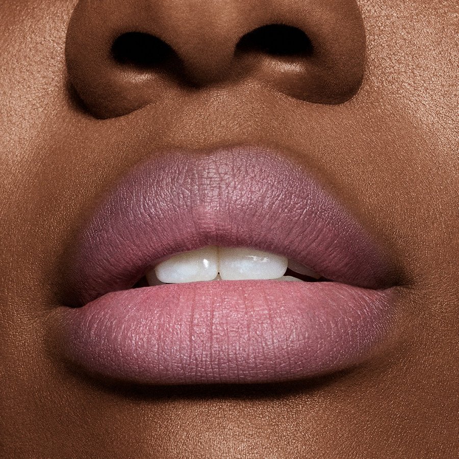Lai iegūtu izcilu dūmakaini matētu toni lūpām un vaigiem, es lietoju tikai M·A·C – divus jaunos Powder Kiss produktus – Hazy Matte Lipstick un Lip + Cheek Mousse.