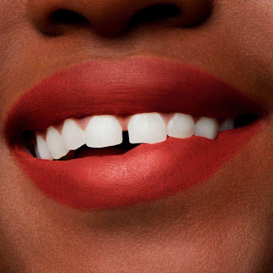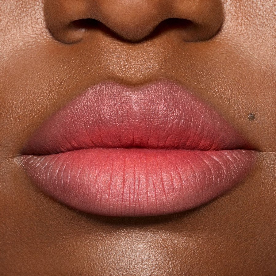 Lai iegūtu izcilu dūmakaini matētu toni lūpām un vaigiem, es lietoju tikai M·A·C – divus jaunos Powder Kiss produktus – Hazy Matte Lipstick un Lip + Cheek Mousse.