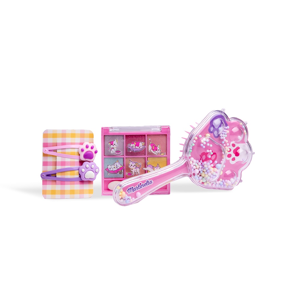 Atklājiet MARTINELIA LULU & DUKI skaistumkopšanas komplektu. Šajā burvīgajā komplektā ietilpst acu ēnu palete ar 6 košām krāsām un aplikatoru, 2 burvīgas matu sprādzes un matu suka. Lieliski piemērots mazajiem, lai jautri pavadītu laiku, piešķirot savam stilam šarmu un jusdamies kopā ar saviem mīlīgajiem kaķu draugiem. Viss nepieciešamais, lai viņi varētu mirdzēt un rotaļāties, ir šajā burvīgajā komplektā.