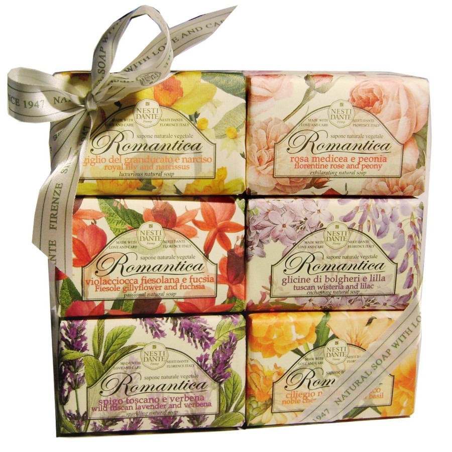 NESTI DANTE komplekts Romantica ir burvīga dāvanu ideja visiem ziepju cienītājiem. Komplektā ietilpst visas Romantica sērijas ziepes: Dzeltenā lefkoja un fuksija, roze un peonija, vībotne un Toskānas lavanda, ķiršu zieds un baziliks, visterija un ceriņi, baltā lilija un narcise.