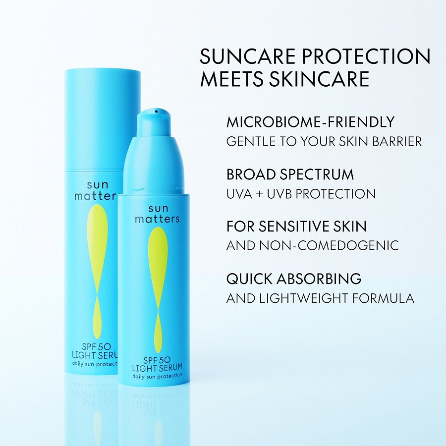 SUN MATTERS Light Serum SPF 50 ir radīts, izmantojot īpaši vieglu, inovatīvu formulu, kas nodrošina plaša spektra aizsardzību visiem ādas tipiem, pat jutīgai ādai. Šis aizsargserums piešķir ādai dabisku mirdzumu, intensīvi mitrina un palīdz uzturēt ādas barjeru, lai āda izskatītos svaiga un ar mirdzumu.